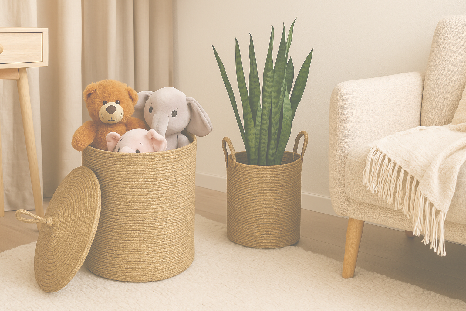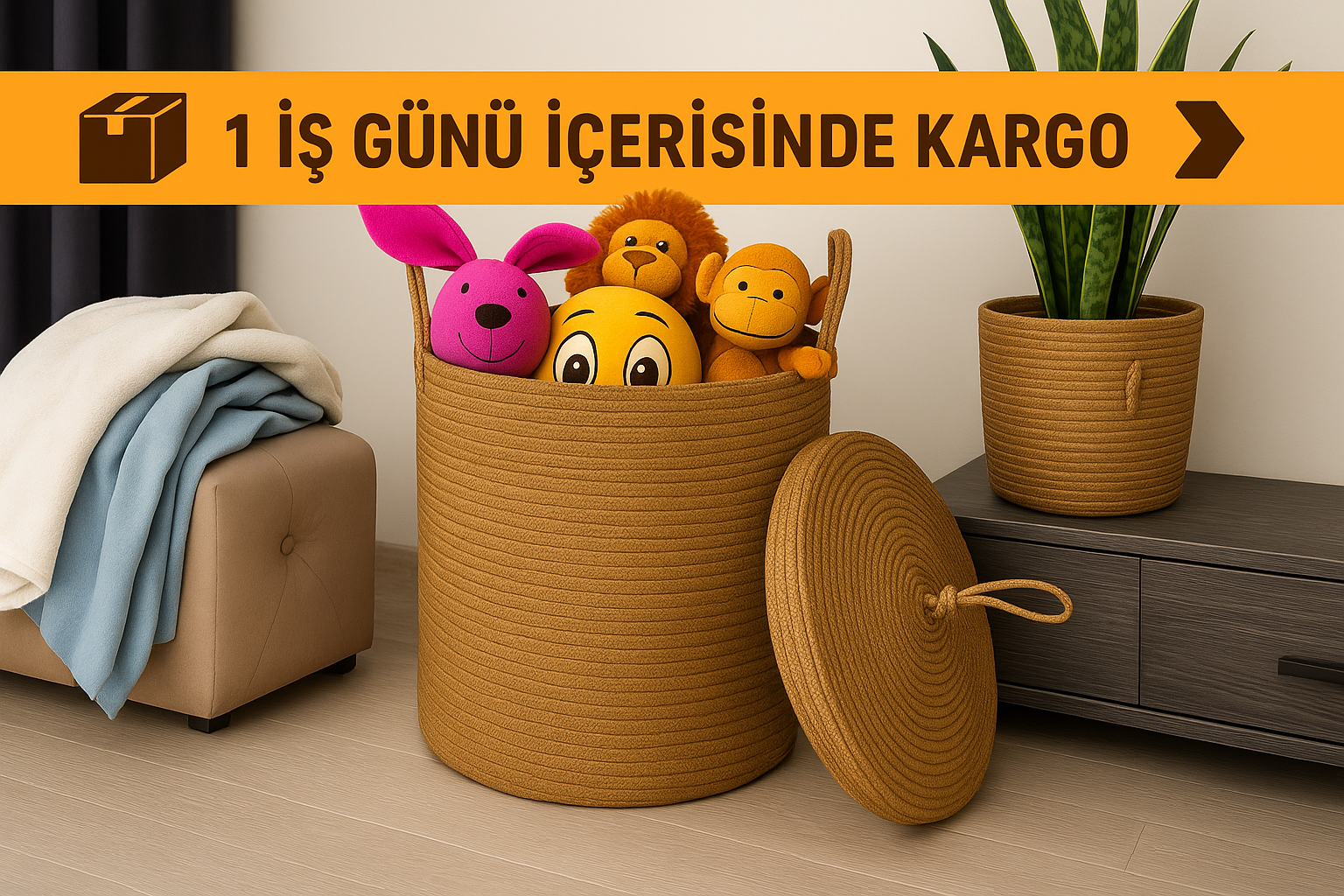 Çok amaçlı doğal hasır sepetlerle evin her köşesi daha düzenli, daha sıcak. Oyuncak, çamaşır veya dekoratif bitki sepeti… Hepsi senin tarzında.