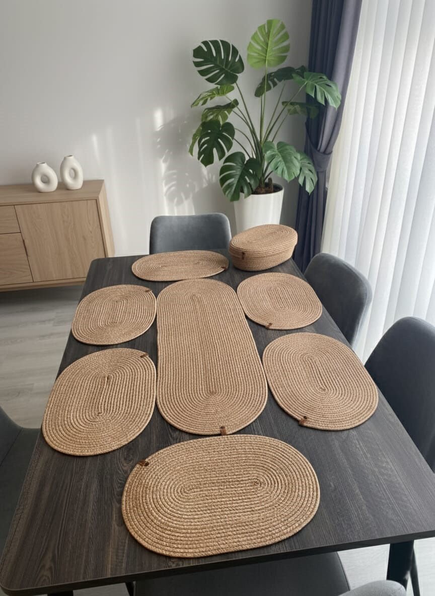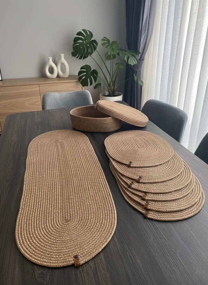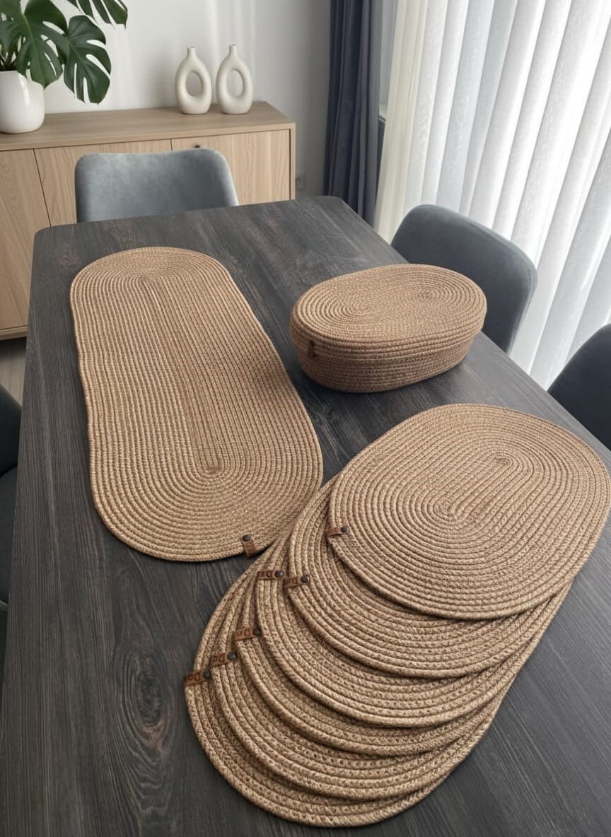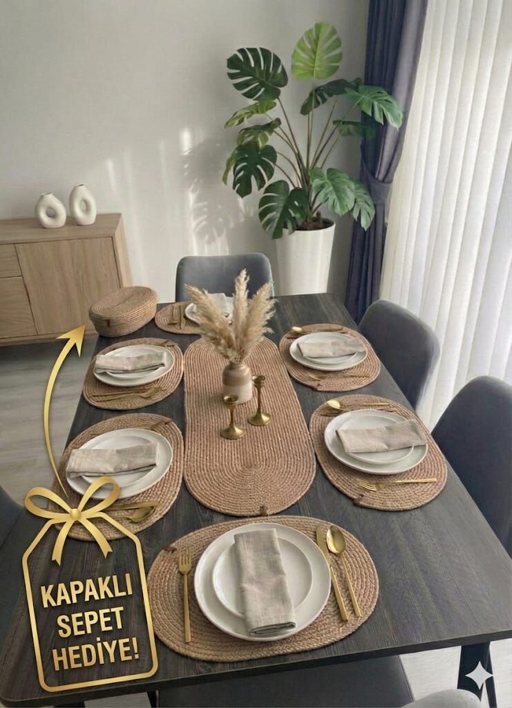 Doğal El Örgüsü Lüks Jüt Hasır Supla & Runner Takımı (6+1 Parça) Sofra sunumlarınıza modern ve bohem bir dokunuş katın! Bu 6 adet Yuvarlak Jüt Supla ve 1 adet Runner içeren toplam 7 parçalık Amerikan Servis Seti, en özel davet sofralarınızın ve günlük şıklığınızın vazgeçilmezi olacak.