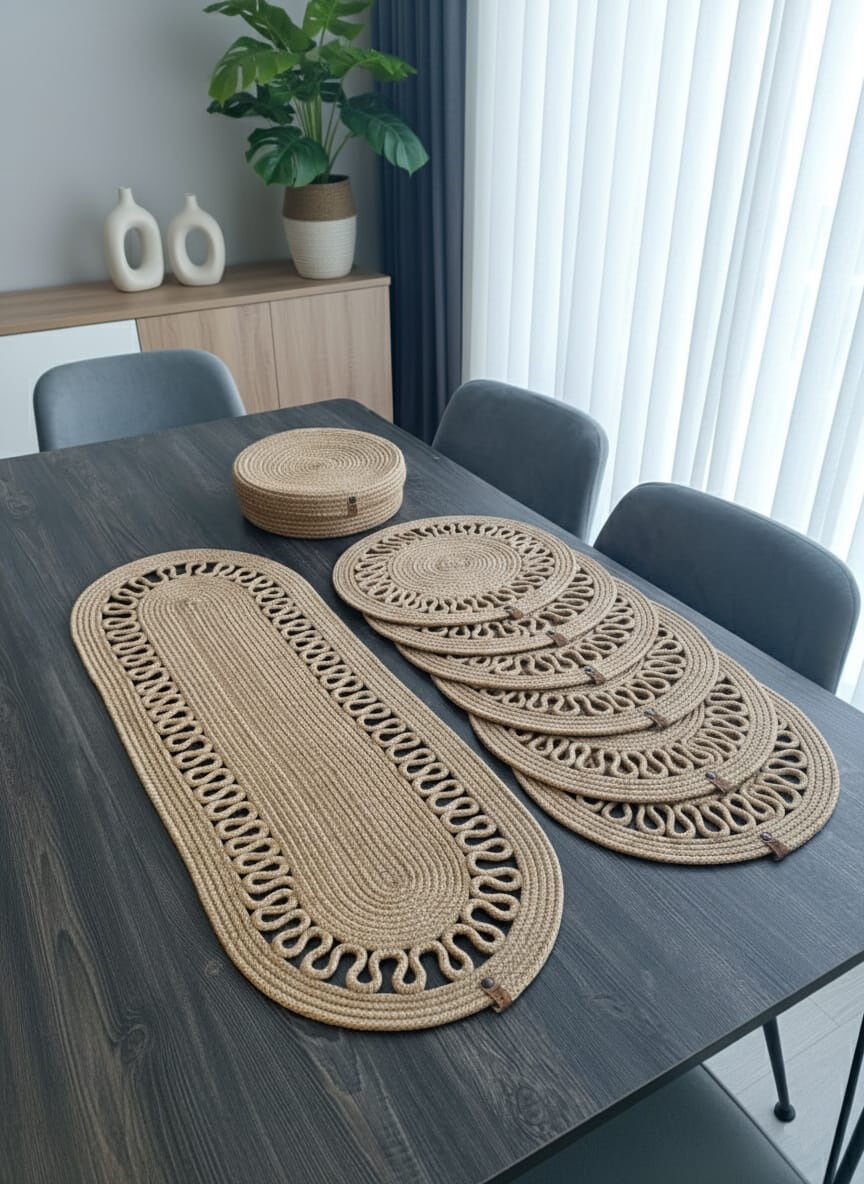 Doğal El Örgüsü Lüks Jüt Hasır Supla & Runner Takımı (6+1 Parça) Sofra sunumlarınıza modern ve bohem bir dokunuş katın! Bu 6 adet Yuvarlak Jüt Supla ve 1 adet Runner içeren toplam 7 parçalık Amerikan Servis Seti, en özel davet sofralarınızın ve günlük şıklığınızın vazgeçilmezi olacak.